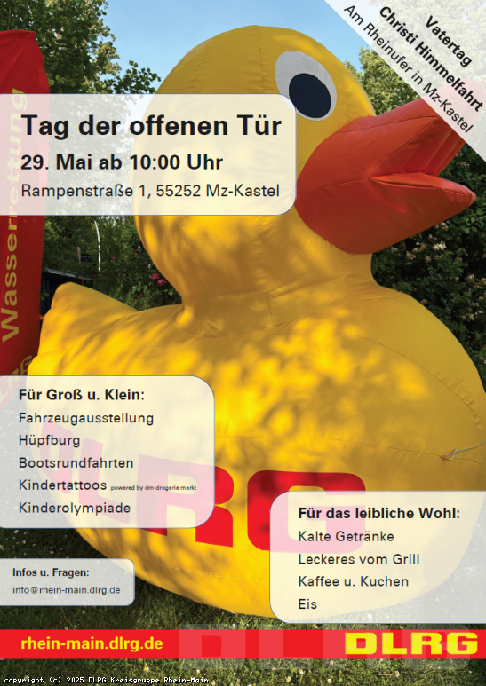 An Christi Himmelfahrt (29. Mai) laden wir Sie herzlich auf unsere Rettungsstation nach Mainz Kastel am Rheinufer ein (Rampenstraße 1, 55252 Mainz-Kastel). Neben einer Ausstellung über unsere Arbeit und der Vorstellung unseres Einsatzmaterials erwarten Sie Leckereien vom Grill sowie kalte und warme Getränke. Probieren Sie doch zum Nachtisch unser Kuchenbuffet oder gönnen sich ein kleines Eis. Alle kleinen Besucher stürzen sich auf die Hüpfburg und die Kletterwand oder nehmen an unserer Kinderolympiade teil. Ab 10:00 Uhr freuen wir uns auf Ihren Besuch. ... Mehr erfahren